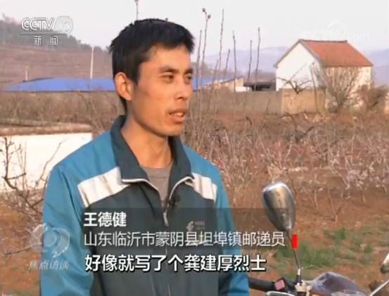 在距离张和庄300多公里外的临沂蒙阴县坦埠镇,邮递员王德健,每天要为20多个行政村居民快递信件和各类包裹,每周工作七天,日均行程近七十公里。2015年春节后的一天,一封收信人为烈士龚建厚的信件,辗转抵达他的手中。因为地址不详细,信被退回。