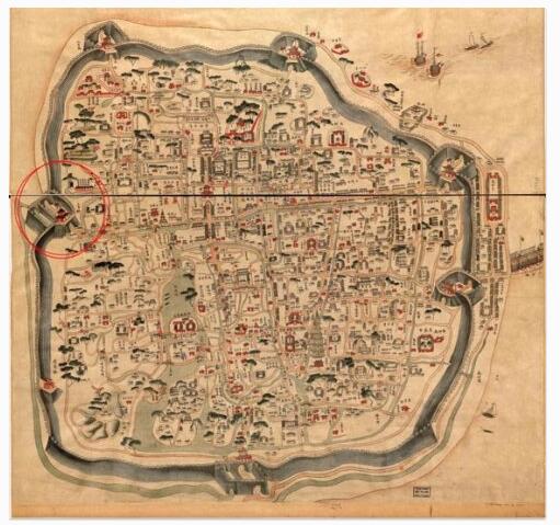 (红圈中为《宁郡地舆图》中的望京门。现保存于美国国会图书馆的宁郡地舆图《宁郡地舆图》是迄今发现的最早且最为详尽的宁波(鄞县)城厢地图,此图约绘于道光年间。)