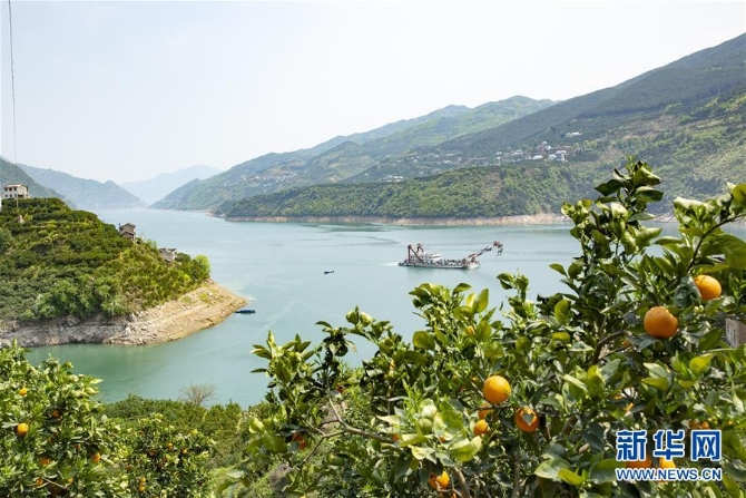 4月8日,船舶从秭归县泄滩乡牛口村橙园旁水域驶过。新华社发(王罡 摄)