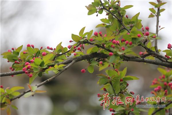 海棠花开花之前会张足了叶片,枝条上会悄悄地长出一些花骨朵,慢慢地盛开,外红内粉,花蕊嫩黄,小巧玲珑。记者了解到,海棠花观赏期集中于4月中旬至4月下旬。