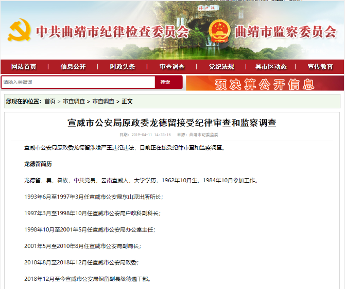 6686体育讯 据曲靖市纪委监委消息:宣威市公安局原政委龙德留涉嫌严重违纪违法,目前正在接受纪律审查和监察调查。