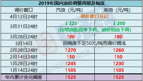 按照现行机制,国内汽、柴油价格根据国际市场原油价格变化每10个工作日调整一次。调价生效时间为调价发布日24时。当调价幅度低于每吨50元时,不作调整,纳入下次调价时累加或冲抵。