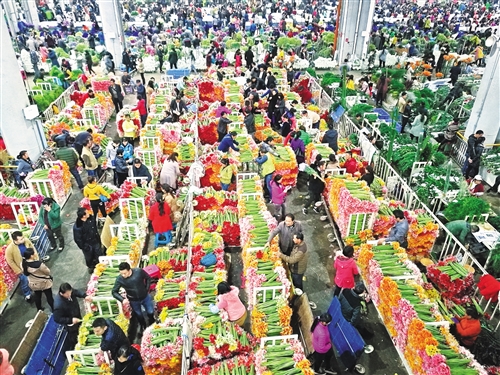 云南省昆明市斗南花卉市场现已发展成为亚洲最大的鲜切花交易市场。图为斗南花卉市场繁忙的夜间交易景象。经济日报记者黄俊毅/摄