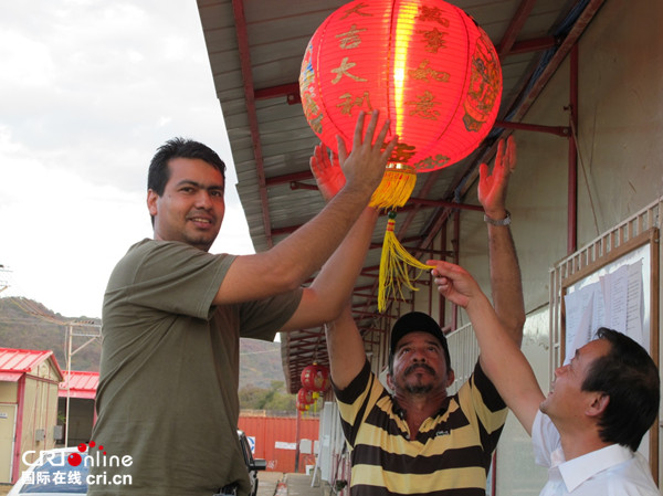 中委员工在营地为迎接中国的春节张灯结彩