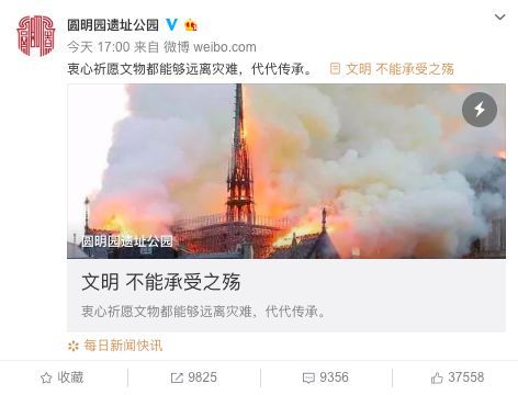 巴黎圣母院大火后,圆明园的官方微博发声。文章冲上热搜,引发网友热议!
