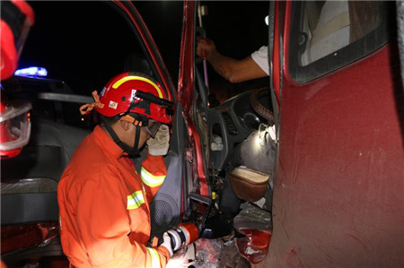21时35分,消防救援人员抵达事故现场看到一小货车车头严重变形,驾驶员左脚被牢牢卡住,无法动弹,情况十分危急。并在事故现场设置警戒区域并立即展开施救,通过撬棍、液压扩张钳等破拆工具对驾驶室进行破拆,扩大救援空间。