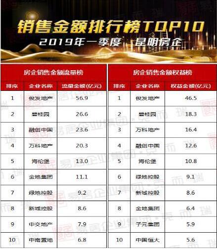根据克而瑞发布的《2019年一季度昆明房企销售金额TOO10排行榜》,今年一季度,俊发、碧桂园、融创、万科、海伦堡、金地、绿地、新城控股、中交、中南置地位居昆明房企销售金额流量榜前十,成为市场赢家。但昆明楼市竞争激烈,十强房企能不能保住自己的位置,还要看后续土地和产品储备。
