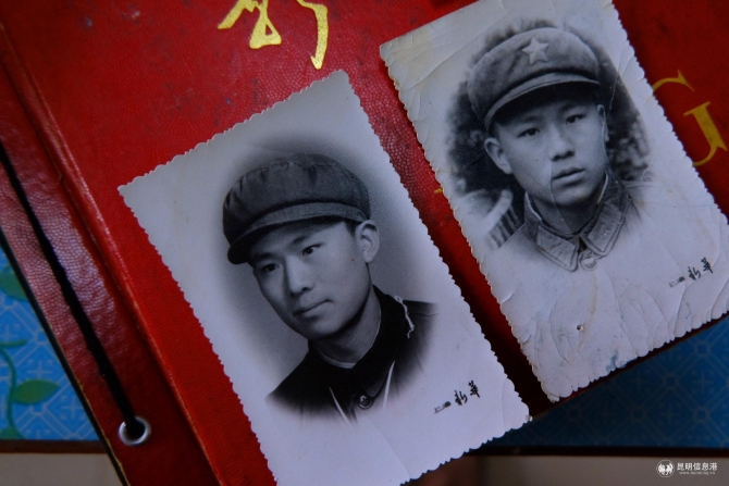 钟远财的影集里,有很多翻拍照片和战友赠送的纪念照片。记者杨博文/摄