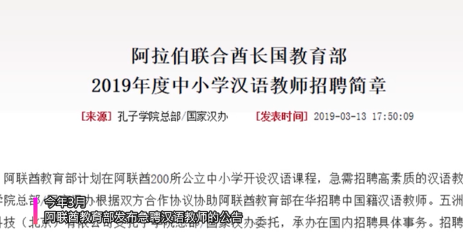 2019年3月13日,阿联酋教育部发布急聘汉语教师的公告,中国孔子学院总部/国家汉办根据双方合作协议,协助阿方在华招聘中国籍汉语教师,月薪约合3万元人民币。阿联酋作为第一个与中国建立战略伙伴关系的海湾国家,也是最早响应中国“一带一路”倡议的国家之一,这则招聘信息的公布让学习对外汉语的同学们异常振奋。