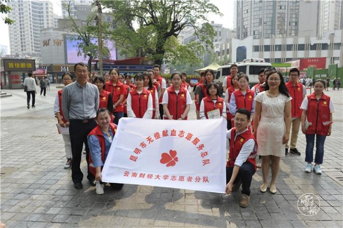 4月28日,云南财经大学无偿献血志愿者分队在昆明宣告成立,这也是昆明市第一支无偿献血高校志愿者分队,标志着高校无偿献血工作向前迈出了一大步。
