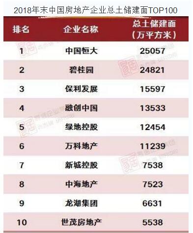克而瑞数据显示,2018年中国房企总土储建面前十榜单