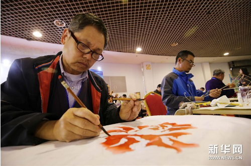 4月27日,参赛者正在绘制风筝上的图案。新华社发张驰/摄