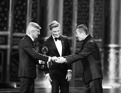 4月20日,影片《幸运儿彼尔》获得“天坛奖最佳影片奖”,张艺谋(右)为领奖者(左)颁奖。新华社记者沈伯韩/摄