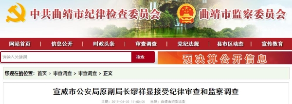 6686体育讯 4月30日,从曲靖市纪委市监委网站获悉,据宣威市纪委监委消息:宣威市公安局原副局长缪祥显涉嫌严重违纪违法,目前正接受纪律审查和监察调查。