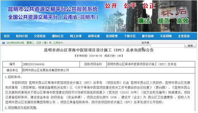 4月30日,昆明市西山区发展投资集团有限公司发布招标公告,对昆明市西山区草海中医馆项目设计施工(EPC)总承包进行招标。公告显示,项目资金来源为政府全资投入,建设方(业主)为西山区卫生健康局,招标人为昆明市西山区发展投资集团有限公司。项目总投资为12314.81万元,项目实施地点在草海片区4-1地块,施工工期暂定为250日历天。