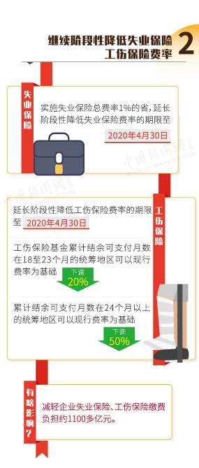 降费率方面,一是降低城镇职工基本养老保险单位缴费比例,高于16%的省份,可降至16%。二是继续阶段性降低失业保险和工伤保险费率,现行的阶段性降费率政策到期后再延长一年至2020年4月30日。