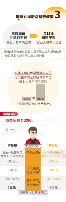 举个例子,假设你的月薪为3000元,当地非私营单位在岗职工平均工资为6000元,在调整之前,你的要按照60%的社保缴费下限也就是3600元来缴费,每月缴费是288元。
