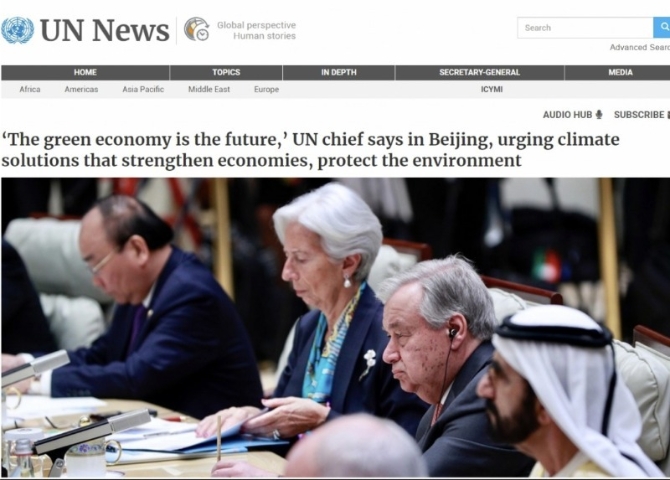 联合国秘书长古特雷斯在“一带一路”国际合作高峰论坛上强调,绿色经济是未来。图片来源:联合国官网