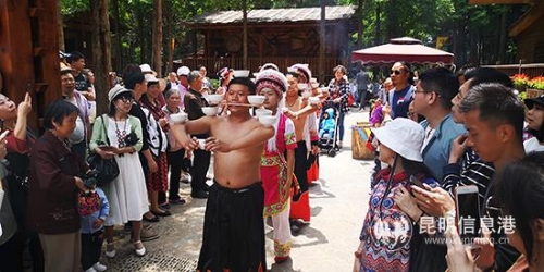 傈僳寨门前,白族小伙吹起唢呐,用民间传统独特的抬酒方式,把香甜的美酒敬献给五湖四海的朋友,让游客体验白族不同的敬酒方式。哈尼寨除了能体验到来自不同民族组成的竹竿阵,还能体验“抓鸡”的乐趣。