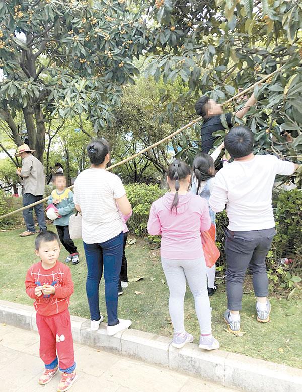 路边绿化带内种了枇杷树,树上挂满葡萄大小的黄色果实。记者现场看到,4个大人带着5个孩子踩着草坪正围在树下,一名年轻男子在摘果子给孩子玩,还叮嘱说“还不熟不要吃”。看到记者举起手机拍照,这一家人才停手。记者走出10米左右回头看,另一女子又继续摘果子,还让孩子“放哨”。