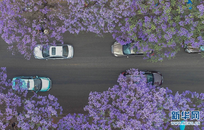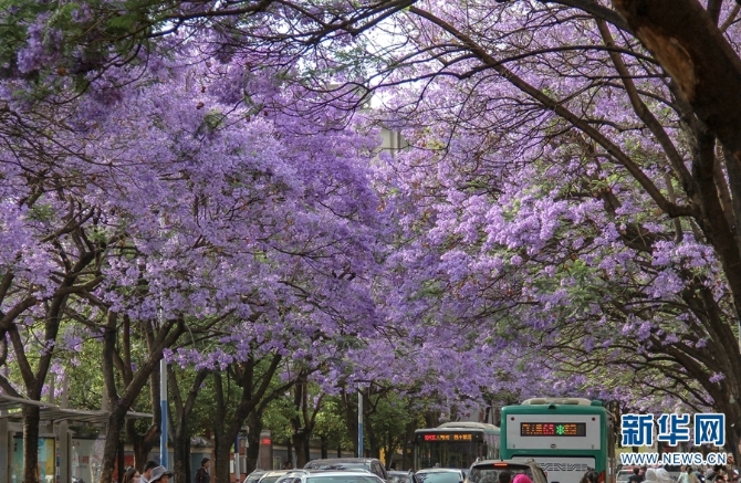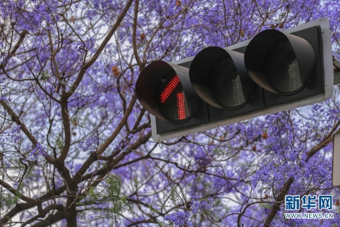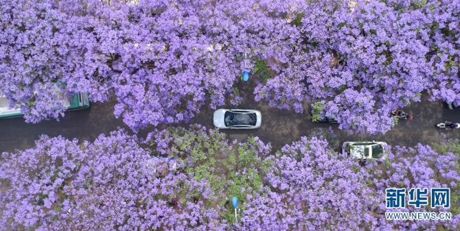 盛放的蓝花楹团团簇簇、层层叠叠,将教场中路装点成一条“浪漫花街”。(新华网 念新洪/摄)