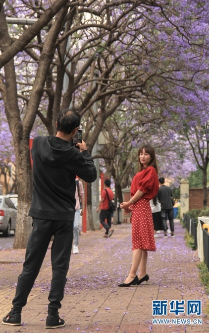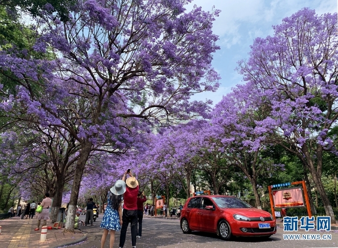 “蓝花楹大道”教场中路,吸引了不少市民和游客前来观赏留影。(新华网 念新洪/摄)