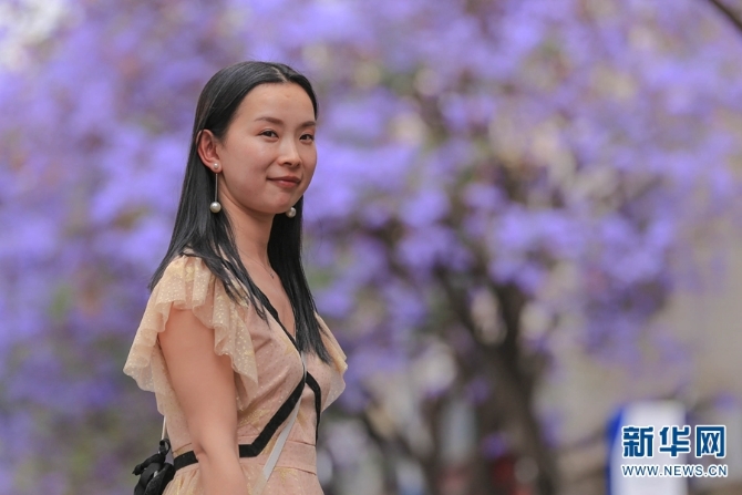 一位女孩在教场中路的蓝花楹树下留影。(新华网 潘越/摄)
