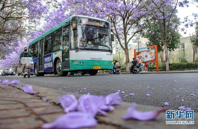 教场中路,落满蓝紫色花瓣的绿化带。(新华网 念新洪/摄)