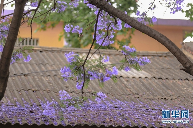 教场中路,一处落满蓝花楹花瓣的屋顶。(新华网 潘越/摄)