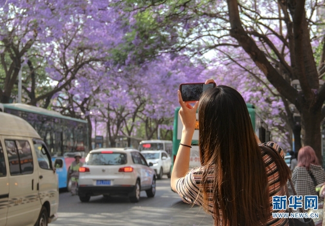 “蓝花楹大道”教场中路,吸引了不少“拍客”。(新华网 念新洪/摄)