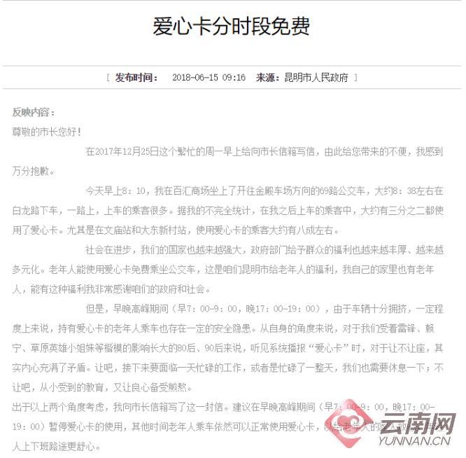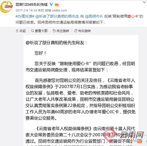 针对网友的留言,昆明市交通运输局回复称,为推动云南省老龄事业的发展,弘扬敬老、爱老、助老的传统美德和社会风尚,让广大老年人共享改革成果,2007年7月1日,《云南省老年人权益保障条例》开始实施。该局督促昆明公交认真贯彻落实条例第22条规定,并指导昆明公交积极组织工作人员为年满60周岁的老年人办理老年爱心IC卡,提供免费乘坐公交服务。