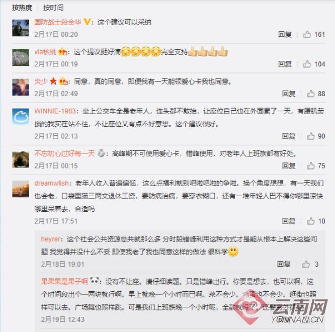 此外,记者注意到,在2019年昆明市“两会”期间 ,昆明市政协委员郝志章曾提出在上下班高峰期对使用“爱心卡”的老人乘坐公交车进行收费的提案,引发大量网友热议。