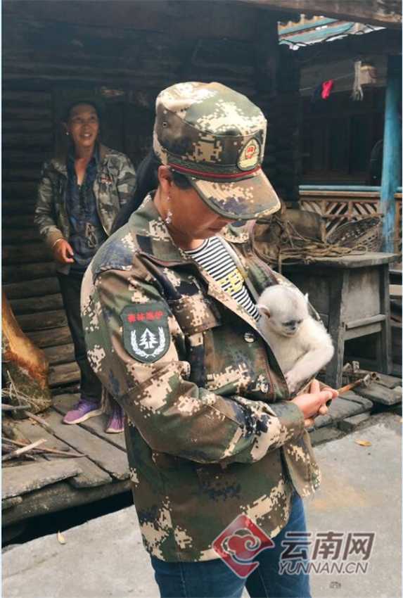 据生态管护员李翠仙介绍,当天中午,她日常巡山护林返回时,在距村子3公里时突然听到路边的树林里传来“嗞嗞嗞”的叫声,寻声走进树林发现一只蜷缩在树下的小猴子。“这只小猴子白肤、杏眼、红唇,有点像滇金丝猴,经对四周进行查看后,未发现猴妈妈的踪影。”她说,小猴子还年幼无生存能力,将它遗留在野外存活率极低,便将其带回家并拨打了康普乡林场的电话求助。