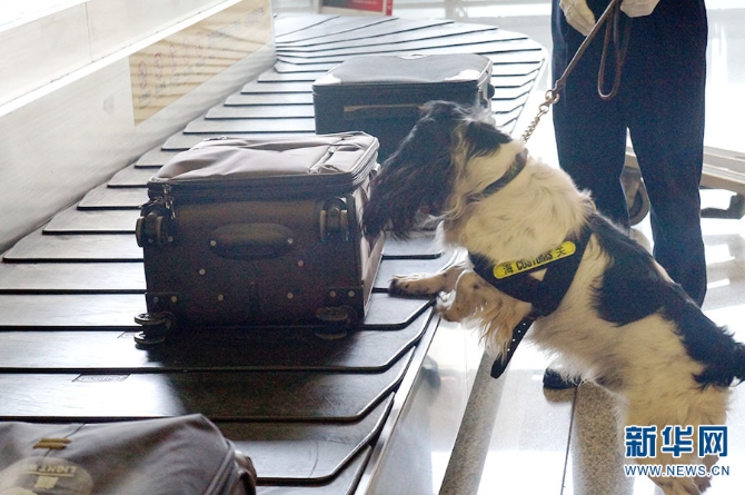 搜查犬在对行李进行搜查。新华网 范芳钰/摄