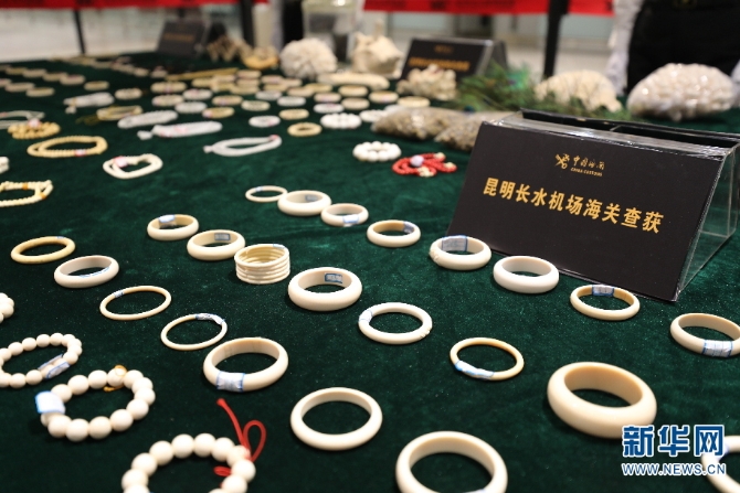 5月8日,昆明海关在昆明长水国际机场口岸举行海关打击象牙等濒危物种及其制品走私成果展示,介绍昆明海关高压严打象牙等濒危物种及其制品走私、强化口岸监管取得的重要成果和良好成效。
