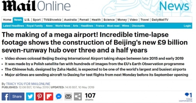 据英国《每日邮报》网站5月10日报道,由数百张卫星图像组成的一段延时视频显示,中国首都新建的北京大兴国际机场已近成型,庞大的工程耗时仅三年半,建设速度之快令人难以置信。