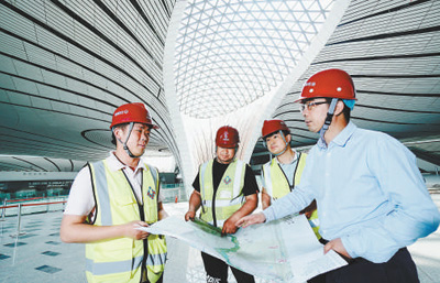 吴志晖(右一)正带领工人对航站楼工程进行局部完善和调整检测工作。
