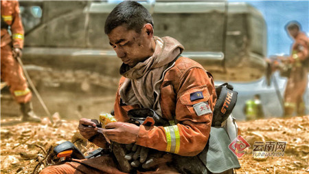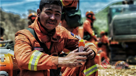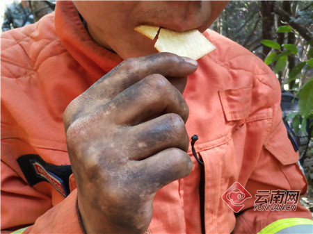 扑火人员在休息间歇吃干粮。陈坤 茹龙俊 覃启程 摄