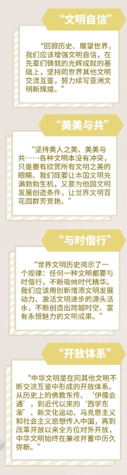 总结亚洲辉煌的文明成果,阐释中华文明深刻内涵,介绍不同文明“相处之道”,并提出亚洲人民三个期待和加强世界上不同国家、不同民族、不同文化交流互鉴的四点主张……