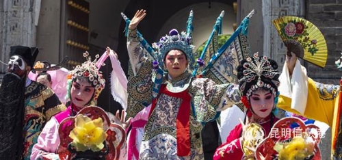 随后,在近日楼前,伴着云南原创滇歌《彩云之南滇剧美》优美的旋律,全国首个戏曲快闪活动在近日楼前上演。来自“国韵流芳”青年研习会、云南省滇剧院、红领巾少儿京剧培训中心春城小学京剧班的演员们,载歌载舞,用一首云南独有的本土戏曲,表达着对家乡的热爱和对祖国的美好祝福。
