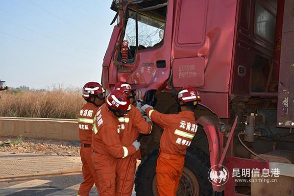 19日上午7时50分,高新消防大队马金铺中队接到119指挥中心调令称,马金铺出城方向昆明南收费站旁发生一起交通事故,造成1人被困,急需消防救援。下达出动命令后,中队立即出动1车8人迅速赶赴现场处置。