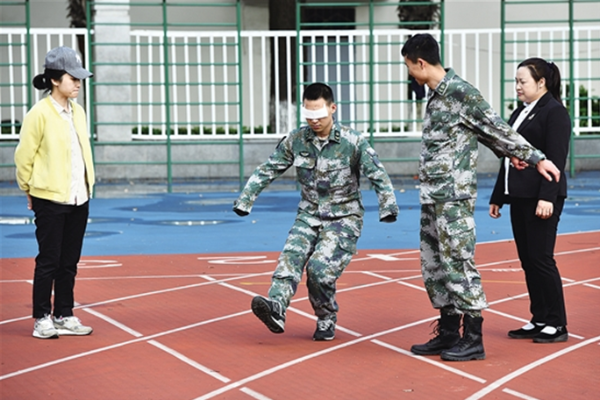 在陆军军医大学操场上,杜富国在家人和战友的陪伴下进行下肢力量康复训练。