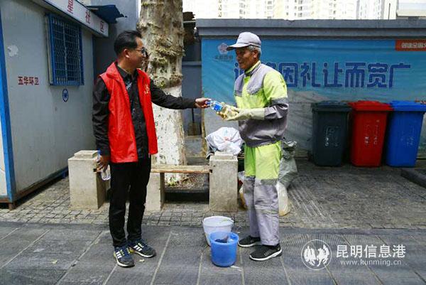 南屏街一环卫工正在擦洗垃圾桶,志愿者顾中国、艾庆玮走上前送上两瓶水,这名环卫工连忙擦擦手,满脸笑容的接过水拧开一瓶盖子喝了起来。