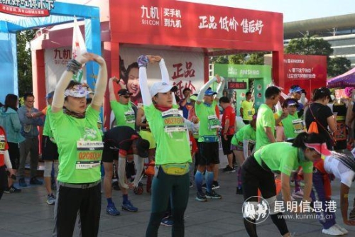 九机展台前正在热身的跑者
