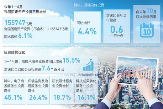打开今年头4个月的投资“成绩单”,延续了增长平稳的态势。今年前4月,全国固定资产投资同比增长6.1%,增速比去年全年加快0.2个百分点。