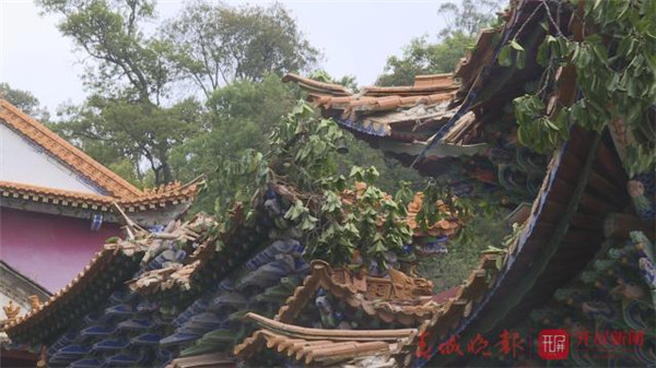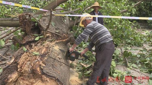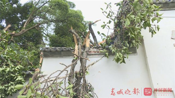 26日凌晨4时许,位于保山市太保公园玉皇阁景区登山台阶南侧的一棵百年古榕树在遭大风侵袭后,一根距离地面8米高、重达13吨的树干被折断,倒在景区路中央登山台阶上,造成古榕树旁边玉皇阁、玉佛寺等景区部分“礼门”被压坏,隆阳区一中一段围墙也小面积受损。由于事发凌晨五无人通行,幸无人员伤亡,但由于倒塌的枝杆比较粗大,几乎遮盖了整段路面,目前游人暂不能由登山台阶通行。