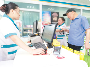 市民在药店用医保卡购药。
