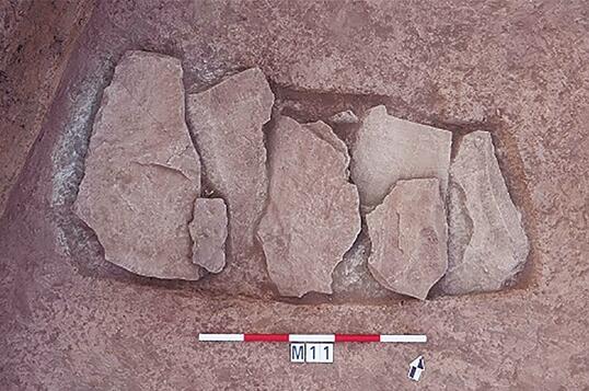 据考古人员介绍,墓向以西南-东北向为主,墓主头向多为西南,葬式以仰身直肢葬为主。大部分墓葬无随葬品,仅有少量墓葬出土陶器、海贝、骨器和蚌饰。石棺墓11号墓葬形制较特殊,分两层,上层仅发现墓主下肢骨,下肢骨上方放置7件陶器,清理至墓底时于墓葬西部另发现4件陶器。清理的房址中仅6号房址为基槽式,其余房址仅发现若干排列有序的柱洞,为干栏式房屋的可能性较大,如1号房址,东西向,平面呈长方形,长约7.3米、宽约3.6米。