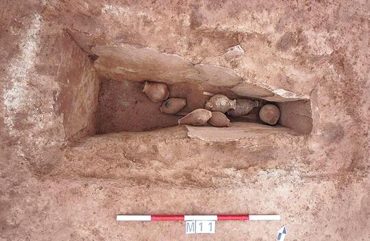 墓葬形制较特殊,分两层,上层仅发现墓主下肢骨,下肢骨上方放置7件陶器,清理至墓底时于墓葬西部另发现4件陶器。
