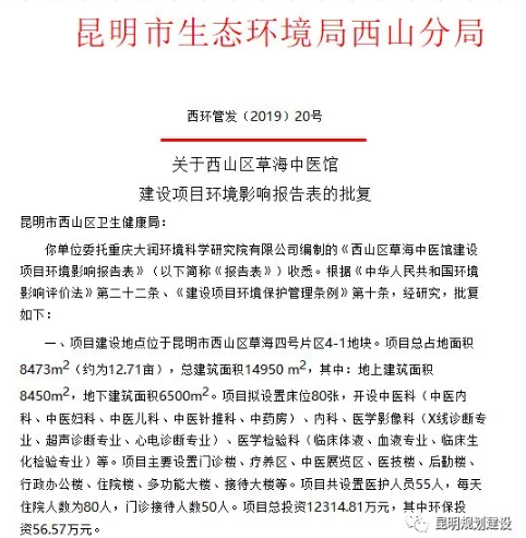 早在今年5月17日和5月22日,西山区政府曾发布了《西山区草海中医馆建设项目环境影响报告表》和《西环管发〔2019〕20号关于西山区草海中医馆建设项目环境影响报告表的批复》,就项目建设的一些基本情况进行了说明。